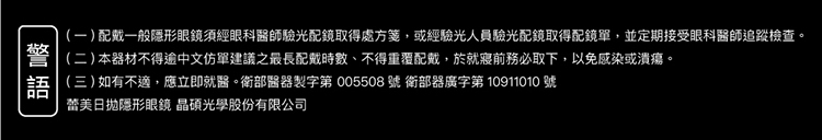 2.本器材不得逾中文說明書建議之最常配戴時數、不得重複配戴,於就寢前務必取下,以免感染或潰瘍。